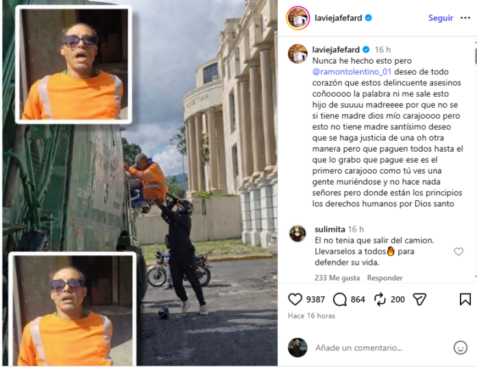 En su pronunciamiento, Fefita La Grande escribió de manera directa: “Nunca he hecho esto pero @ramontolentino_01 deseo de todo corazón que estos delincuentes asesinos… la palabra ni me sale… esto no tiene madre… deseo que se haga justicia de una u otra manera, pero que paguen todos, hasta el que lo grabó, que pague ese es el primero… ¿cómo tú ves una gente muriéndose y no hace nada? ¿Dónde están los principios, los derechos humanos?”.