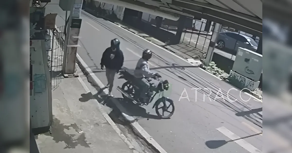 En el material audiovisual se observa a dos individuos que se desplazaban en una motocicleta y que se detienen frente al local antes de ejecutar la acción.